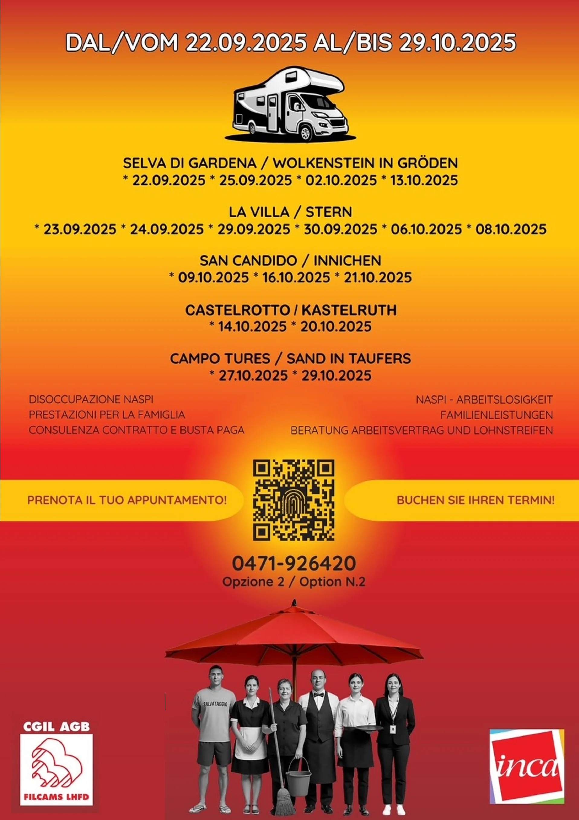 La nuova edizione prenderà il via lunedì 22 settembre da Selva di Val Gardena e farà tappa a La Villa, San Candido, Castelrotto e Campo Tures. Novità di quest’anno: la presenza rafforzata a La Villa, con sei giornate dedicate per rispondere alla forte richiesta proveniente da quell’area, e l’introduzione della tappa di Castelrotto, per avvicinarci ulteriormente ai lavoratori dell’Alpe di Siusi.