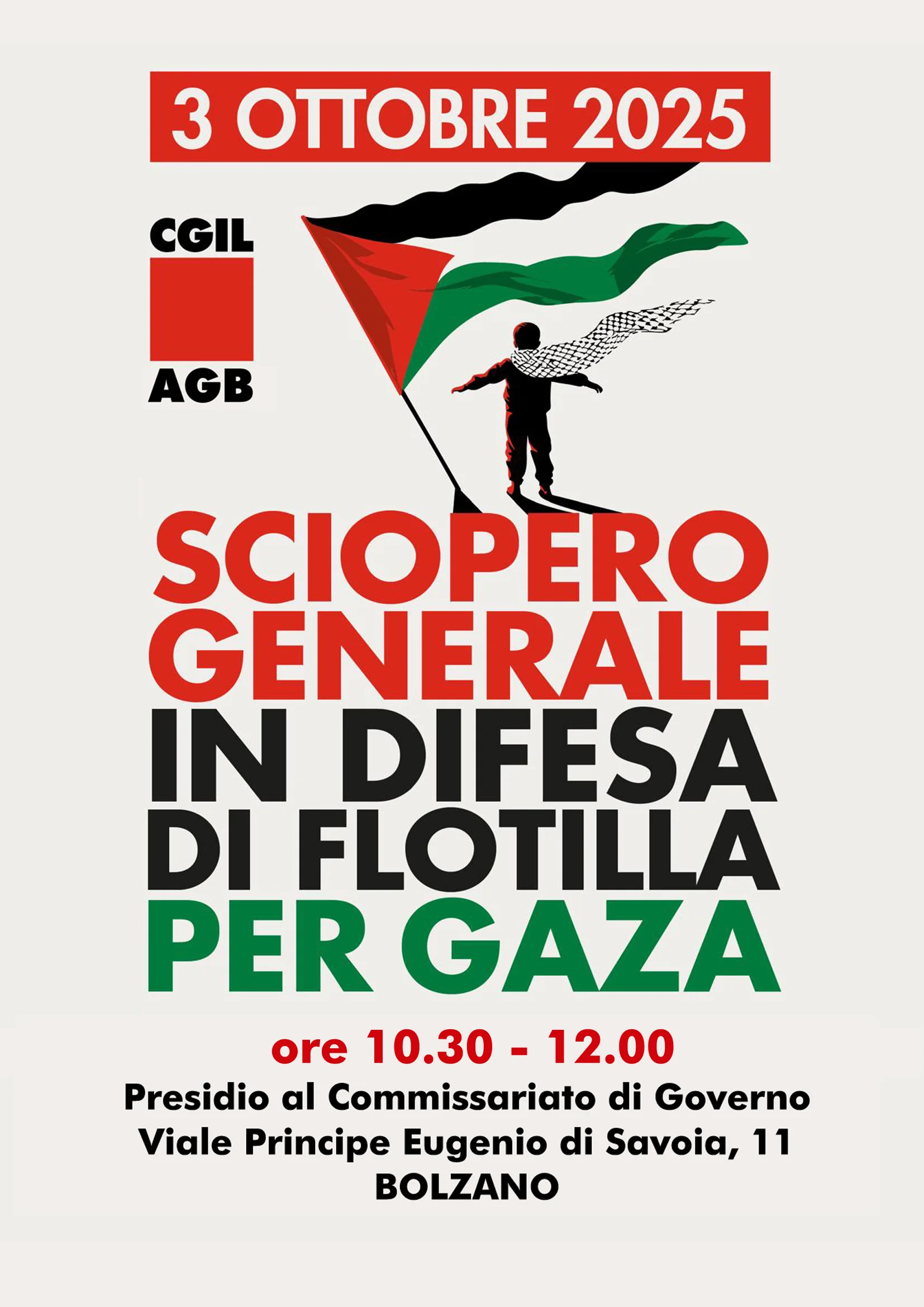 La Cgil annuncia, in difesa di Flotilla, dei valori costituzionali e per Gaza, lo sciopero generale nazionale di tutti i settori pubblici e privati per l’intera giornata di venerdì, 3 ottobre. A Bolzano il giorno dello sciopero è previsto un presidio davanti al Commissariato di Governo alle ore 10.30.